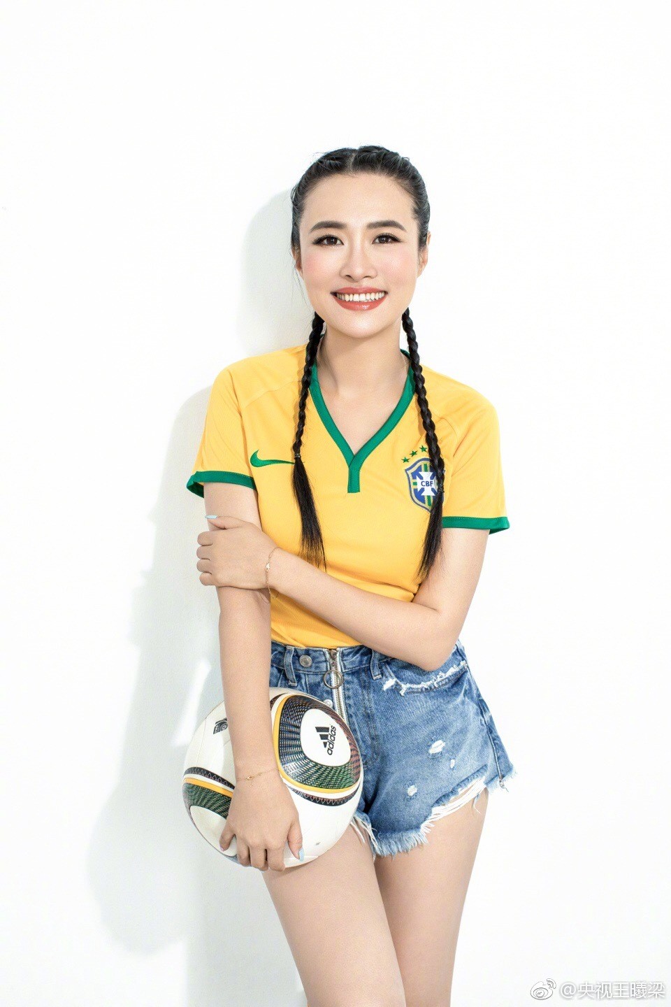 这组写真展现了王曦梁对足球运动的热爱与独特的时尚诠释。她身着一件经典的蓝色足球训练上衣,搭配利落的牛仔短裤,将运动活力与日常时尚完美融合。最引人注目的是那双亮眼的橘色丝袜,不仅大胆地突破了传统运动装的色彩框架,更与她脚下简洁的白色运动鞋一同,衬托出健康修长的腿部线条。这让人不难理解为何她会被观众和媒体亲切地称为“央视第一美腿”和“天足大长腿”。写真中的她,或手持足球嫣然浅笑,或奔跑跃动充满力量,每一帧画面都洋溢着阳光与健康的气息。